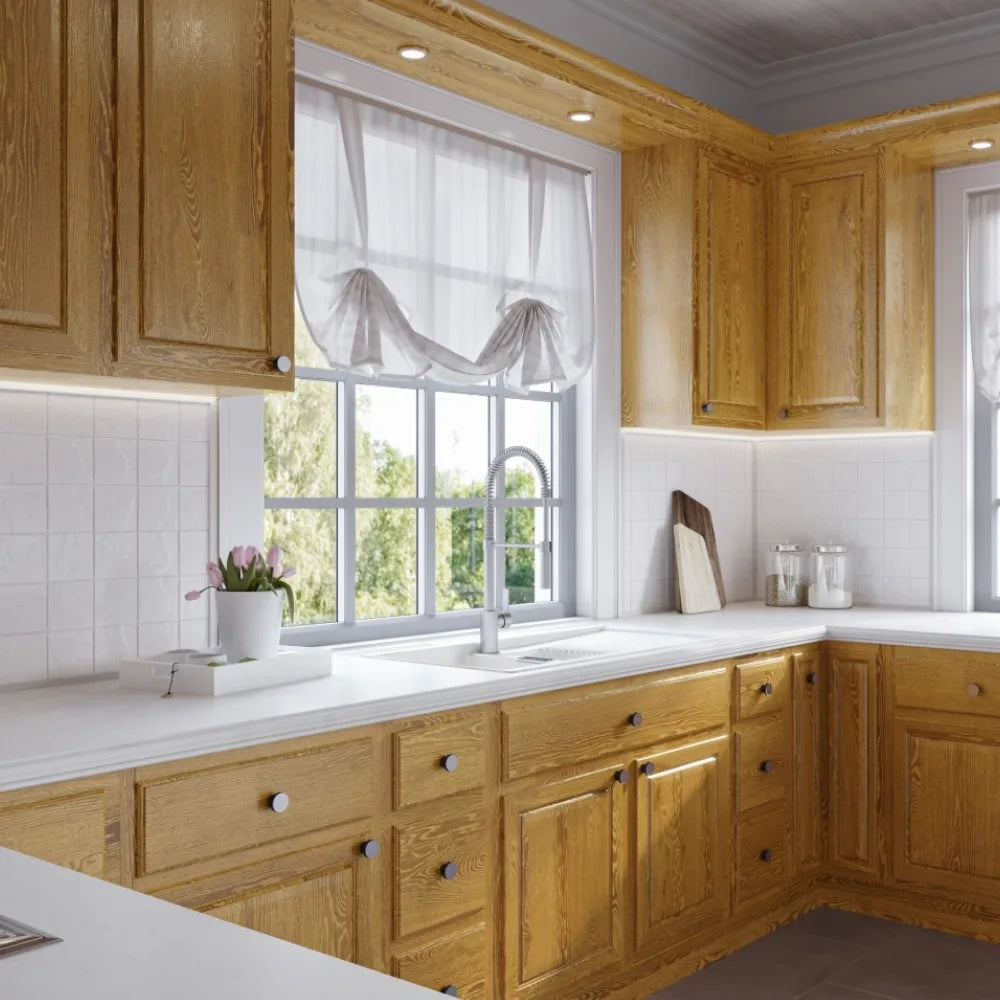 Experience the warmth and lasting quality of Country Oak cabinets. Solid oak construction is finished with a rich honey exterior, while a light wood interior provides practical functionality, making these cabinets a charming and enduring addition to your home.